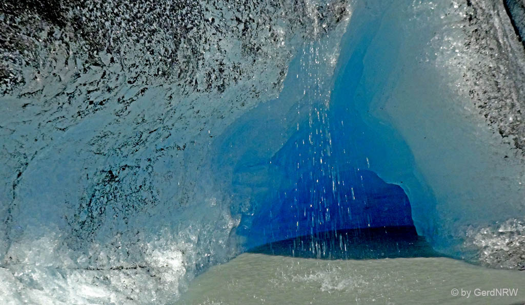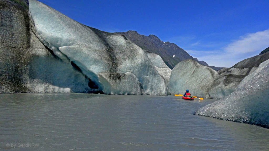bildet durch regelmäßiges Kalben in den See zahlreiche Eisberge.