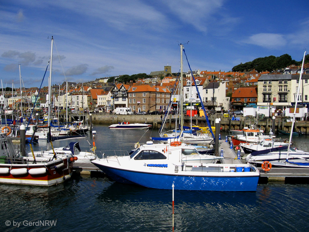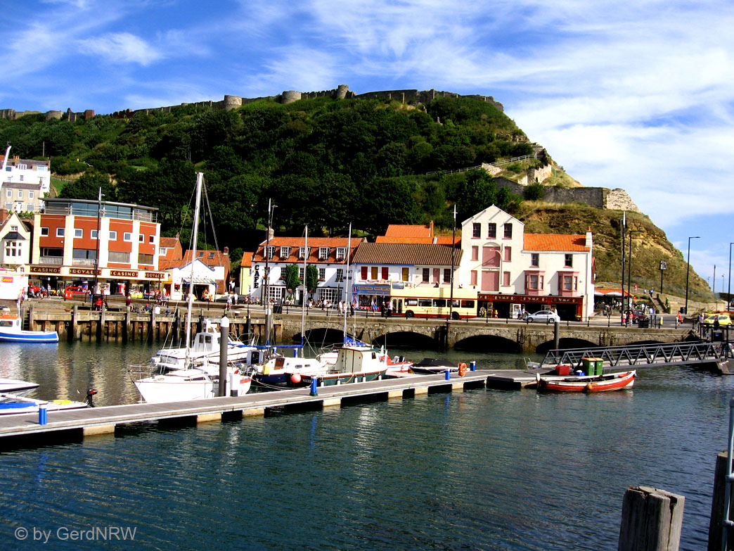 Hafen von Scarborough und Ruinen der Burg von 1150